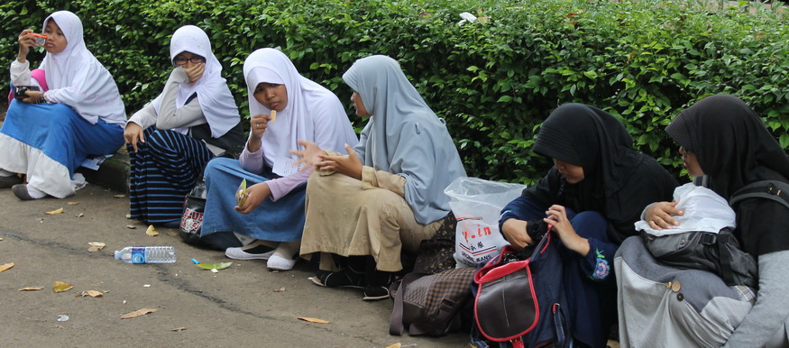25 Jam empat sore santriwati PM mulai duduk kelelahan di luar Istora