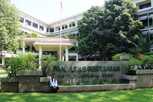 Abdullah (santri kalong Pesantren Media homescholling kelas 5 SD) berpose di depan Fakultas Pertanian IPB