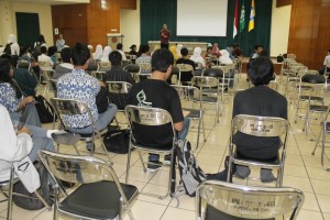 Santri ikhwan (berkaos hitam) menunggu saat seleksi di dalam Auditorium Toyib